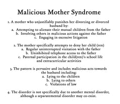 Individuals suffering from Divorce-Related Malicious Mother Syndrome may engage a wide range of other individuals in their attacks upon the ex-husband. However, with this particular criterion, the individual with Divorce-Related Malicious Mother Syndrome specifically lies to other individuals in the belligerency against the father. Some examples include the following: