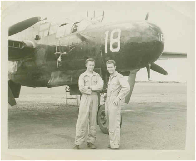 Your Gramps, 1st Lt. Mont Goodell & Fighter Pilot in front of his P-61 Black